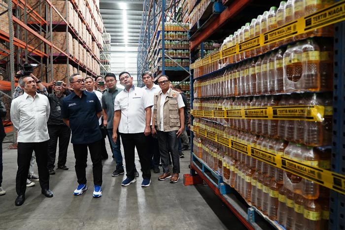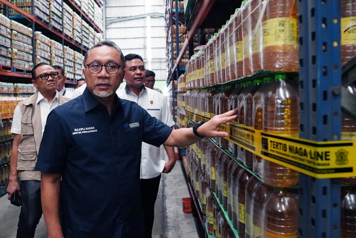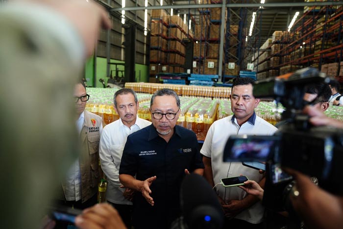 Menteri Perdagangan, Zulkifli Hasan melakukan pengawasan terhadap ketersediaan minyak goreng merek MINYAKITA di PT Bina Karya Prima (BKP), Marunda, Jakarta, Selasa (7 Feb).